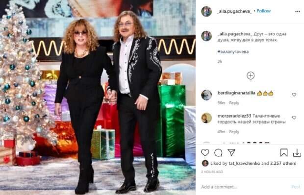 Примадонна сделала себе кудряшки, украсила шею ожерельем из камней, надела очки и обулась в сапожки на каблуке. Игорь Николаев по-детски трогательно взял Аллу Борисовну за руку и так вошел с ней в кадр. Певец нарядился в черный костюм с серебристыми узорами, а также надел рубашку, расстегнув верхнюю пуговицу. Стоит отметить, что артисты стали очень похожими друг на друга благодаря прическам. Поклонники не смогли остаться равнодушными к внешнему виду Пугачевой и Николаева, они выразили свои впечатления в комментариях под фото: "Друг – это одна душа, живущая в двух телах"; "Восхищение!!! Алла, стиль, элегантность - все при Вас!!! Браво Алла