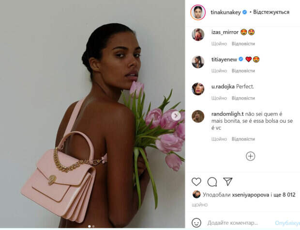 Пышные волосы Тина собрала в элегантную гульку, чтобы шевелюра не отвлекала внимание от идеального тела звезды. Нежный образ красотка дополнила розовыми тюльпанами, которые она прижала к груди. Стоит отметить, что фото кончалось там, где начинался аппетитный «орешек» молодой красотки. «Это все любовь», - подписала фото модель, намекая на любовь к брендовым сумкам. В комментариях экзотической красотке оставили массу приятных слов. «Ты великолепная, Тина», «Сумка и красивые тюльпаны», «Не знаю, кто красивее, эта сумка или ты», «слишком красиво», «Самая красивая женщина в мире!», «Очень экзотично», «цветочный дуэт», «Теперь я действительно хочу эту сумку», - пишут пользователи сети. Ранее мы писали, что Тина Кунаки выровняла свои кучерявые волосы, сделав ретро-прическу. Красотка стала выглядеть совсем по-другому. Напомним, что пышногрудая Тина Кунаки завлекла молодым телом в бикини к себе на пляж: "Самая красивая русалка". Как сообщала Politeka, Тина Кунаки забралась в воду и очаровала пикантным декольте в экзотическом образе: "Гипнотизирует". Также Politeka писала, что Тина Кунаки в бикини заворожила мокрым телом на пляже: "Настоящая бразильянка".