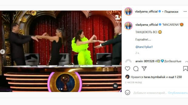 В этот раз ведущие предложили им станцевать известный во всем мире танец Macarena. Судьи с удовольствием приняли вызов. Так, Макс Чмерковский танцевал с приглашенной судьей Сантой Димопулос, а Влад Яма – с Екатериной Кухар. Танцоры не сдерживали себя в движениях, и явно отрывались по полной, а в конце Яма неожиданно схватил Кухар и наклонил ее, будто в танго. Стоит отметить, что Кухар эффектно выделялась на фоне остальных судей благодаря неоново-зеленому платью, состоящему из сплошных волн полупрозрачной ткани. «Macarena». Танцуют все. Листайте!», - подписал кадры Яма. Его поклонники тут же отреагировали. «Владик быстро ориентировался в паре с Кухар», «Огонь», «Очень жду Вас в Харькове», «Люблю», «Красивые», - пишут люди. Напомним, Кухар едва не оседлала Влада Яму за кулисами, кадры уже в сети. Как сообщала Politeka, судья "Танців з зірками" Чмерковский прильнул к Санте Димопулос, пока зрителям крутили рекламу. Также Politeka писала, что Влад Яма из "Танців з зірками" показал, как развлекается с женой в джакузи.