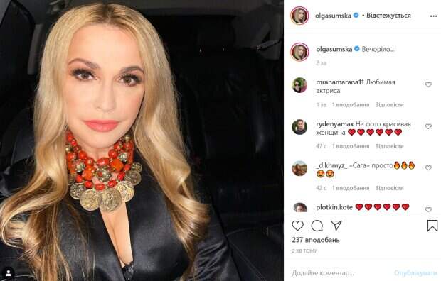 Волосы Сумской были красиво уложены, образ дополнял вечерний макияж. Особенной изюминкой вечернего наряда стали красивые красные бусы. Выглядела актриса превосходно. «Вечерело…», - подписала фото актриса. За полчаса ее фото собрало почти 2 тысячи лайков. В комментариях ей оставили массу приятных слов. «Любимая актриса», «Бусы красивые. Очень вам идут», «Роскошная женщина», «Самая прекрасная женщина в мире», «Какая Вы роскошная», «Темнело, и я увидел, как красивая девушка прекрасно проводит время», «Вы идеал и пример для всех женщин», «Всегда молодая и красивая», «Богиня», «Ослепительная красавица», - пишут пользователи сети. Ранее мы писали, что Ольга Сумская откровенно рассказала о трудностях в семье. Она призналась, что до сих пор не видела новорожденного внука, так как ее дочка Антонина Паперная живет в Москве. Из-за карантина увидеться сейчас у них нет возможности. Напомним, что похорошевшая Ольга Сумская раскрыла рецепт целебной настойки из каштанов: «Рекомендую в любом возрасте». А еще Politeka писала, что Сумская удивила новым образом, превратившись в «фифу» из Италии: «Все молодеет и молодеет». Также Politeka сообщала, что 54-летняя Ольга Сумская показала себя без фотошопа: "Как ведьма. ..".