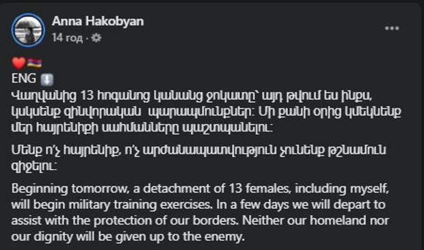 Жена премьер-министра Армении Никола Пашиняна Анна Акопян пройдет военные сборы и отправится в Нагорный Карабах Как передает Politeka.net, об таком решении она сообщила на своей страничке в Facebook. "С завтрашнего дня отряд из 13 женщин, в том числе и я, приступит к военным занятиям. Через несколько дней мы отправимся защищать родину.