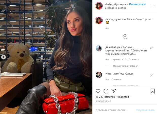 Компанию в ресторане ей составил плюшевый мишка. Поклонники Даши обрадовались, что их любимица не болеет и оставили много лестных комментариев. "У вас уже отрицательный тест? Смотрю вы уже вышли с изоляции", "Королева", "Вкус и нюх появился?", "Самая прекрасная Даша", "Не болей больше и будь здорова", " А что уже 2 недели прошло, отрицательный тест - это не показатель нужно время! Будьте здоровы, все равно рада, что вам лучше", "Ой, какая красивая", - писали под постом победительницы "Холостяка". Напомним, Даша из "Холостяка" пустилась во все тяжкие после измены Макса Михайлюка: "Вторая Волочкова" А еще Politeka писала, что в жизни пары из "Холостяка" случилось непредвиденное, Даша ошарашила деталями: "Макс признался, что..." Также Politeka сообщала, победительница "Холостяка" Даша Ульянова без белья ошеломила дерзкой выходкой: "Будущая звезда"