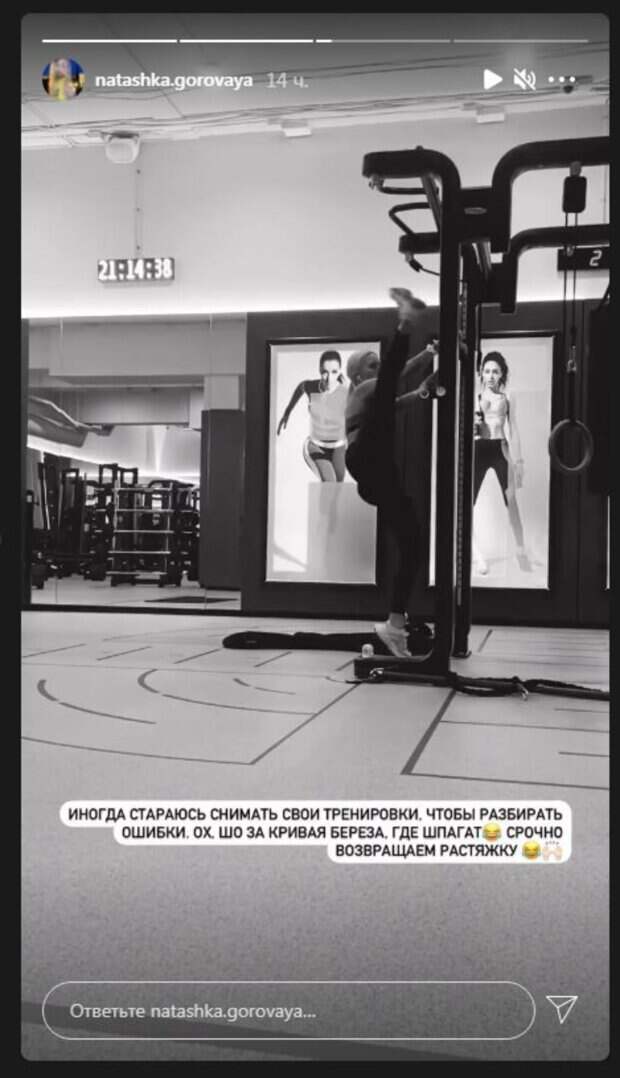 Сейчас Наташа Горовая уже взрослая девушка, которая строит карьеру, а также активно ведет соцсети. На страницу девушки подписаны 29,9 тысячи пользователей сети. Она много рассказывает о занятиях спортом. В частности, в одних из последних сторис Горовая удивила растяжкой. Девушка находилась в зале, для тренировок она выбрала топ и лосины. Красотка закинула ногу выше головы и начала тянуться у тренажера. Пока девушка только учится, и у нее не получается воздушный шпагат, как у балерины Анастасии Волочковой, но Наташа показала хороший результат, хотя и в подписи себя раскритиковала. "Иногда стараюсь снимать свои тренировки, чтобы разбирать ошибки. Ох, что за кривая береза? Где шпагат? Срочно возвращаем растяжку", - написала приемная дочь Потапа. Отметим, Потап и Ирина Горовая уже давно расстались, но сохранили дружеские отношения. Напомним, приемная дочь Потапа в алом бикини подставила упругие формы солнышку и устроила экстрим Как сообщала Politeka, приемная дочь Потапа показала язык в Одессе и поразилась людям Также Politeka писала, что приемная дочь Потапа в узком топике "козырнула" точеной фигуркой перед зеркалом