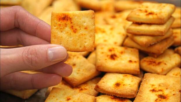 Отдельно соединить муку и разрыхлитель. Затем постепенно просеять в яично-молочную смесь и замесить тесто. Если тесто будет липнуть к рукам, добавить еще немного муки. Раскатать тесто тонко и разрезать на квадратики, или длинные полоски, или прямоугольники. По желанию смешать немного растительного масла с водой, смазать крекеры и присыпать солью или другими приправами. Выпекать 10-12 минут при 200 ℃. Домашние хрустящие крекеры – подробный рецепт в видео: