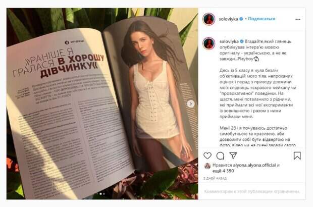 Девушка продолжает свой творческий путь и сейчас, активно занимаясь блогом в Инстаграм, где делится с фанатами всем интереснім. В новой публикации девушка призналась, что решила сняться для мужского журнала Playboy. Девушка надела белоснежное мини-белье, которое идеально подчеркнуло формы девушки. "Мне 28 и я чувствую достаточно самобытной и красивой, чтобы позволить себе быть откровенной на фото, видео или на сцене ради своего удовольствия. Когда я, 22-летняя «цветочек» украинской музыки (или ваш любимый эпитет), впервые получила предложение публикации откровенных фото, я испугалась. И попала в известную ловушку "а что скажут люди?", - написала Христина. Фанаты поставили более 4 тысяч лайков и написали комментарии: "Купила за час до того, как вышел пост", "Такие красивые и меткие слова", "Богиня ты, вот и все", "Я аж захотела Плейбой купить", "Очень красиво и очень не вульгарно", "Все прекрасно, ничего откровенного". Напомним, звезда "Голосу країни" и любимица Вакарчука выдала новый хит и поразила откровением Также Politeka сообщала, что Вакарчук на фоне слухов о романе с участницей "Голосу країни" уехал из Киева А еще Politeka писала, что финалистка "Голосу країни" Соловий рассказала, кто ее родители и о сотрудничестве с Вакарчуком