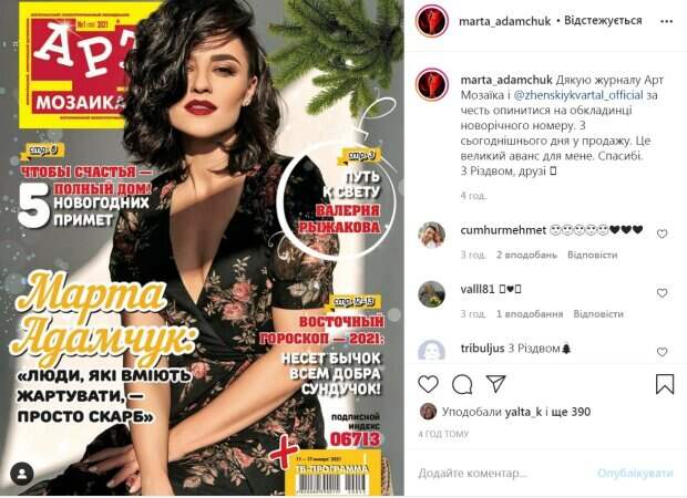 Известная актриса, звезда "Женского квартала" Марта Адамчук похвасталась своим новым достижением Об этом пишет Politeka.net со ссылкой на страничку подопечной Елены Кравец в Инстаграм. Знойная брюнетка украсила обложку одного из украинских журналов. "Спасибо журнала Арт Мозаика и @zhenskiykvartal_official честь оказаться на обложке новогоднего номера.