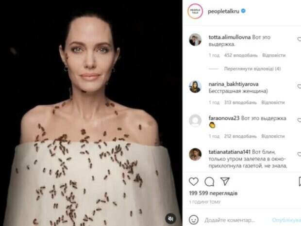 Именно поэтому каждый новый кадр с Джоли, представленный в Инстаграм на фан-страницах актрисы, всегда получает множество откликов и различных отзывов о ее работе. Не так давно звезда не только возобновила свою деятельность, но и решилась на экстравагантную съемку с пчелами, специально для важного события. В белом платье, приспущенном с плечь Джоли удивляла далеко не фигурой. «Потрясающая пчелиная охота Анджелины Джоли. Загляните за кулисы потрясающей работы, снятой всемирно известным фотографом Дэном Уинтерсом. Живые пчелы покрывают верхнюю часть тела Анджелины на потрясающем снимке, целью которого является воссоздание культового портрета Ричарда Аведона 1981 года «Пчеловод»», - сказано в подписи к ролику. Мы также писали об этой фотосессии, что целью повторения картины был довольно очевидный посыл.Джоли снялась в рекламе, которая должна привлечь внимание к проблеме исчезновения пчел. На одном из новостных пабликов в Инстаграм поклонники стали обсуждать смелую выходку актрисы. «Вот это выдержка», «Бесстрашная женщина)», «Не знала, что исчезают», «Мое уважение этой великолепной женщине», «молодец, что привлекает внимание к исчезновению пчел», «Я б сдох от страха», «Опасная женщина», «Она просто космос, обожаю», - пишут пользователи сети. Напомним, что Анджелина Джоли в соблазнительном платье без стыда поиграла губами со своим пальчиком Как сообщала Politeka, Анджелина Джоли в топе-корсете с декольте очаровала раскрепощенным видом Также Politeka писала, что бесстыжая Анджелина Джоли в прозрачной майке вывалила напоказ «бидончики», смутив отца и брата