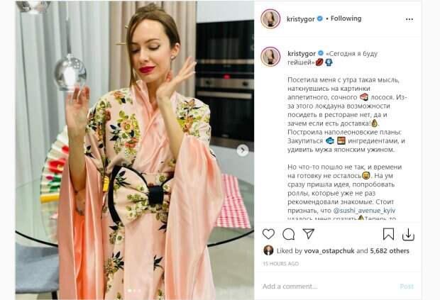 Жена украинского телеведущего Владимира Остапчука приготовила приятный сюрприз в японском образе Как сообщает Politeka.net, девушка нарядилась гейшей, чтобы порадовать знаменитого мужа, и показала результат на своей странице в соцсети "Инстаграм". На одном из опубликованных фото Кристина Горняк запечатлена в нежно-розовом шелковом халате с цветочными узорами и бантиком на поясе, волосы она собрала в традиционную японскую прическу и скрепила спицами.