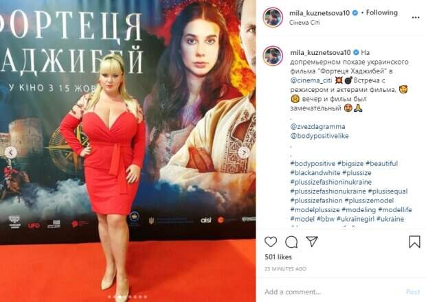 Еще одной изюминкой можно назвать полупрозрачную ткань на плечах, украшенную декоративными цветами - этот элемент придал образу девушки национального колорита. В качестве обуви Мила выбрала простенькие белые туфли на шпильках. В таком наряде она просто великолепно смотрелась на фоне режиссера и других гостей. "На допремьерном показе украинского фильма "Фортеця Хаджибей" в @cinema_citi