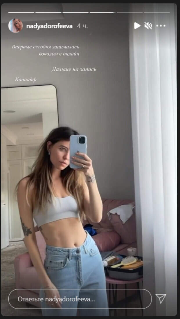 «Впервые сегодня занималась вокалом в онлайн. Дальше на запись. Каааайф», - отметила артистка. Как известно, Дорофеева много времени уделяет спорту. Неоднократно у себя в Инстаграм она показывала, что занимается дома и даже привлекает к тренировкам своего мужа, певца Владимира Дантеса. Стоит отметить, что певица практически не ограничивает себя в еде. Наоборот, она очень любит поесть, особенно, когда готовит ее муж. Добавим, что совсем недавно Дорофеева начала сольную карьеру. Сейчас артистка занимается записью песен для нового альбома. Напомним, что Дорофеева показала, как прошли ее 10 лет жизни с Дантесом: "Если вы расстанетесь...". Еще Politeka писала, что Дорофеева появилась в объятиях Макса Барских практически сразу после годовщины отношений с мужем: "Отлично...". Также Politeka сообщала, что Надя Дорофеева ужаснула изменениями во внешности: "После вакцины...".