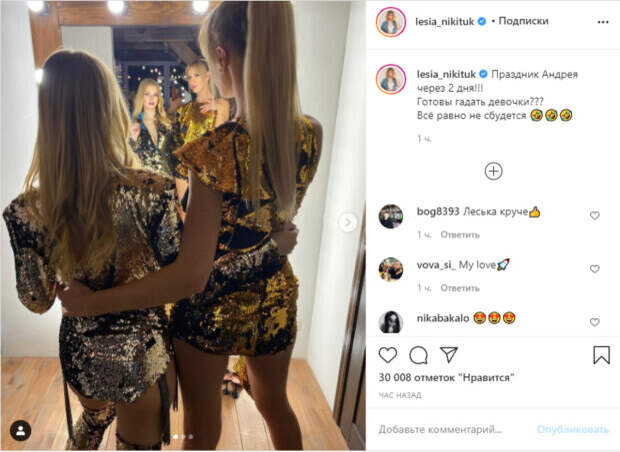 "Тесная" ткань еле-еле прикрыла ее упругие ягодицы (лучше и не думать, что произойдет, если Леся случайно нагнется). На одном из фото длинноногая Никитюк все-таки сверкнула тем, что у нее под юбкой - спасибо фотографу, снявшего красоток откуда-то снизу. В подписи довольная Леся напомнила публике об Андрееве Дне - 13 декабря, когда незамужним девушкам можно гадать на суженого. "Праздник Андрея через 2 дня!!! Готовы гадать девочки??? Всё равно не сбудется