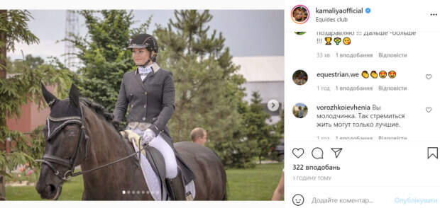 И благодарю вас за поддержку на соревнованиях, всех, кто приехал, позвонил, написал доброе слово в соц. Сетях. В эту выездку я дебютировала сложные схемы вместе с мастерами спорта и кандидатами в мастера. Так что для первого старта наездила на неплохой результат, но, конечно же, есть к чему стремиться, тем более, что следующие соревнования уже через месяц!», - подписала фото звезда. В комментариях ей оставили массу приятных слов и поздравлений. «Вы молодчинка. Так стремиться жить могут только лучшие», «Камалия-красотка!», «Это огонь. Успехов», «Молодец», «Вы очень милая и позитивная», - пишут пользователи сети. Напомним, что Камалия не сдержала чувств после похорон Чапкиса: «Жаль, что на Земле не живут вечно». Как сообщала Politeka, Камалия рядом с мускулистым красавцем пожаловалась на невезение: "Так и знала!". Также Politeka писала, что Камалия публично обратилась к мужу-миллиардеру: «Захур, сколько же…».
