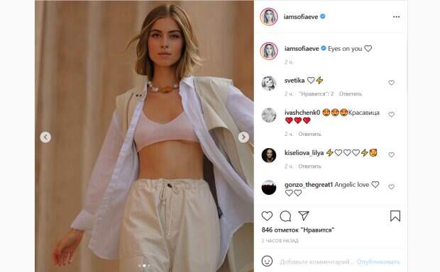 На своей странице в Инстаграм девушка поделилась новыми снимками, на которых продемонстрировала свой модельный потенциал, пишет Politeka.net. Так, на фото Соня предстала в костюме из свободных бежевых штанов и жилетки. Также на девушке была белая рубашка, которую Соня оставила распахнутой, и бледно-розовый лифчик. В таком виде Евдокименко уверенно позировала перед камерой, показывая свою природную красоту и стройную фигуру. Поклонники не могли не оценить этот образ юной красотки. «Красавица», «Ангельская любовь», «Тут красуня…», - пишут люди в комментариях к фото Сони. Напомним, 20-летняя внучка Ротару засветила каждый изгиб в невероятно тонком платье: "Ох, ничего себе". Как сообщала Politeka, юная внучка Ротару выдала секрет своей фантастической фигуры: "В расслабленном режиме...". Также Politeka писала, что 20-летняя внучка Ротару показала формы в чересчур коротком топе: «Горячее солнца».