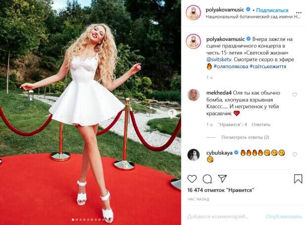 Для выступления певица выбрала легкий летний образ, идеально подходящий к такому мероприятию под открытым небом. На ней было короткое белое платье с юбкой-солнцем, отдаленно напоминающее балетную пачку. Длинные волосы Полякова завила в мелкие кудри, а разбавить свой невинный образ звезда решила ярко-красной помадой. Певица вовсю зажигала на сцене в компании горячей подтанцовки, которая также была вся в белом. На кадрах артистка соблазнительно позирует одна и в компании танцоров, к которым она не стеснялась прижиматься у всех на виду. На последнем кадре также можно увидеть, как звезда позирует с высоко задранной юбкой. Поклонники тут же принялись обсуждать новую порцию фотографий звезды. «Оля ты как обычно бомба, хлопушка взрывная Классс..... И негритенок у тебя красавчик», «Осиная талия. Шикарная женщина», «Тигрица Винницкая», «Как всегда прекрасна», «Кукла барби», «Афигеть, красотка, аж слюнки бегут даже у меня!», «Олечка, Вы - божественная, талантливая и очень красивая!», «Ух, жарень», - пишут люди. Напомним, Полякова разделась на яхте ради пикантного кадра, Лолита не смогла смолчать: «Оля, у тебя ноги как…». Как сообщала Politeka, Оля Полякова пошалила на камеру в обжигающем наряде. Также Politeka писала, что 15-летняя дочь Поляковой потрясла взрослой фотосессией в крошечном топе: «Это что-то особенное».