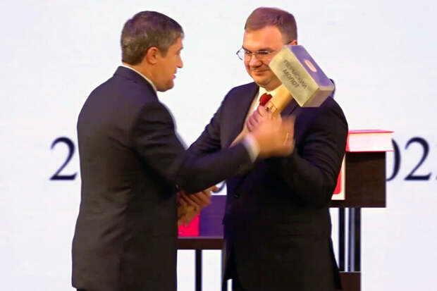 Губернатор Пермского края Дмитрий Махонин подарил на инаугурации новому мэру Перми Эдуарду Соснину 18-килограммовый молот. «Чтобы дурь чиновничью из головы вышибать», — пояснил глава региона. В интернете подарок сравнили с кувалдой — одним из символов ЧВК «Вагнер». Впрочем, Махонин назвал эти ассоциации «полным бредом», так как молот является одним из символов Перми и Мотовилихинских заводов, где был изготовлен подарок.