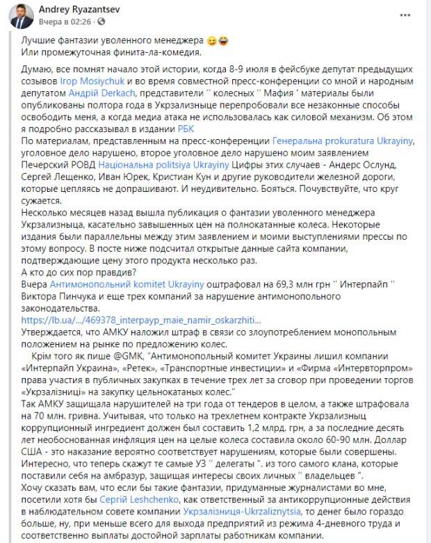 В своей заметке Андрей Рязанцев напомнил, что компания «Интерпайп» пыталась продать УЗ колеса по цене, которая была минимум вдвое выше среднерыночной. Когда он, еще будучи отказался тратить почти два миллиарда гривен на коррупционную схему, его освободили от должности, но он рассказал детали дела на пресс-конференции. «По материалам, изложенным на пресс конференции, Генеральная прокуратура Украины возбудила уголовное дело, второе уголовное дело было возбуждено по моему заявлению Печерским РОВД. Фигурантами этих дел является Андерс Ослунд, Сергей Лещенко, Иван Юрек, Кристиан Кун и другие топ-менеджеры железной дороги, упорно не ходят на допросы. И не удивительно. Боятся. Чувствуют, что круг сужается », - отметил Рязанцев в своей заметке. Он напомнил, что АМКУ оштрафовал компанию «Интерпайп» и связанные с ней компании «РЕТЕК» и «Транспортные инвестиции» на 70000000 гривен, и на три года отстранил компании от публичных закупок. «Учитывая, что только на трехлетнем контракте Укрзализныци коррупционная составляющая должна была составить 1200000000 грн, а за последние десять лет необоснованное завышение цен на цильнокатаних колеса составляло около 60-90 млн долл США, то наказание точно соответствует нарушением, которые были осуществлены», - выразил уверенность Рязанцев. Он также подчеркнул, что если бы Сергей Лещенко, как ответственный за антикоррупционные ДИИ в Наблюдательном совете компании Укрзализныця, относился к работе ответственно, то в компании было бы гораздо больше денег. «Но именно Сергей Лещенко пытался неприкрытой ложью скрыть реальную ситуацию по этому вопросу и выгородить других участников этого заговора внутри компании, а именно Андерса Ослунда, который покинул Наблюдательный совет Укрзализныци под давлением неоспоримых фактов», - указывает Рязанцев. Напомним, ранее Андрей Рязанцев заявлял, что компания Виктора Пинчука «Интерпайп» хотела продать «Укрзализныци» цельнокатаные колеса в 4 раза дороже себестоимости. По его подсчетам, коррупционная составляющая соглашения превышала миллиард гривен. «В мае 2020 года, когда я ушел из УЗ, объявили тендер на 3 года, на сумму 2,4 миллиарда гривен. Учитывая, что цена колес была в два раза завышена, получается, что коррупционная составляющая в нем была около 1000000000 200000000, остальные - цена колес. Чтобы вы понимали: себестоимость колеса, если верить специалистам - в районе 8000 гривен сейчас. То есть, 15 000 - это уже цена с 100% -ной рентабельностью. Они хотели «задрать» ее еще в два раза - до 36 000 », - объяснял Рязанцев.