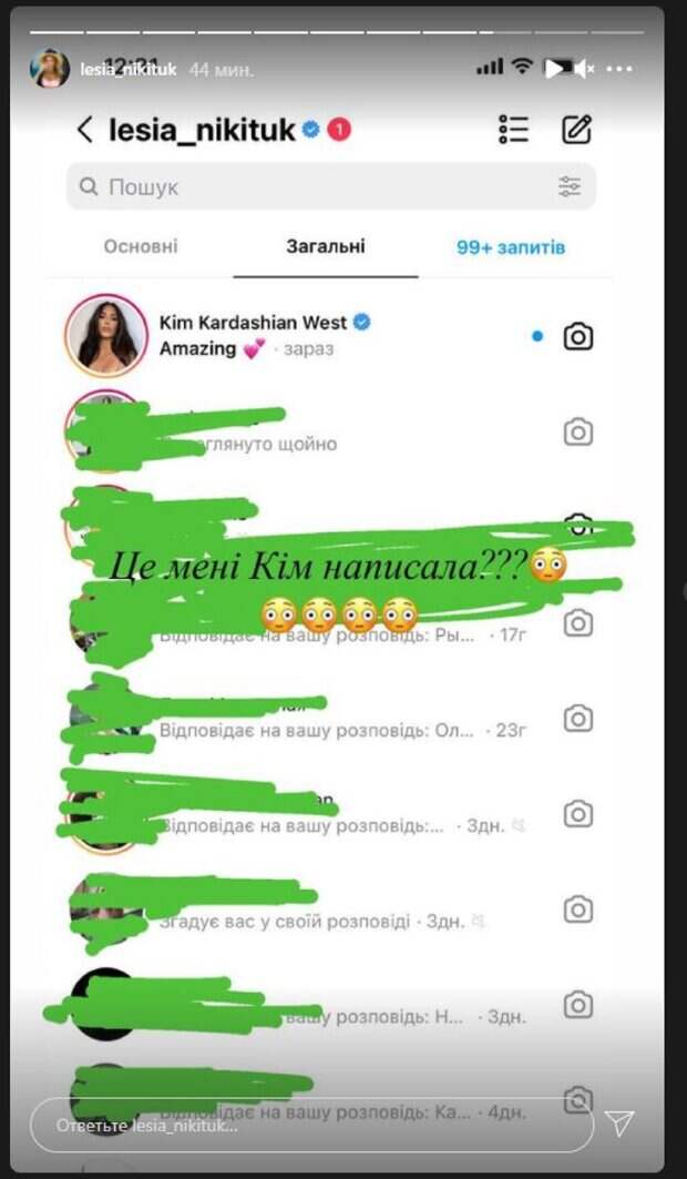 .. !!!! У вас было такое?", - написала Леся под нескромными снимками в купальнике, шутя о выросшей пятой точке. И вот, Леся Никитюк показала свой директ. В самом верху было сообщение от Ким Кардашьян. Американская светская львица написала украинской телеведущей "Amazing" (удивительная - прим.ред.) и поставила два розовых сердечка. Как можно понять, Ким ответила на какую-то стори Леси. "Это мне Ким написала???", - удивленно написала Никитюк. "Ребят, мне написала сама Ким. Значит я реально Эмейзинг", - добавила Леся. "Джаред???? А ты мне что-то будешь писать?", - написала в заключительном стори Никитюк. Напомним, мужчина оказался у ног Леся Никитюк, пикантный момент попал на камеру А еще Politeka сообщала, что Никитюк в кожаных шортах и сапогах устроила рисковую прогулку в холодную погоду Также Politeka писала, что Никитюк в необычном белом костюме проговорилась о новом шоу с ее участием