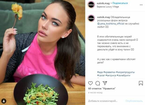 Соответствующее фото было обнародовано в одной из фан-групп. Артистка позировала в ярко-розовой футболке, а сверху надела и распахнула серую кофту на молнии. Модель сделала пышный хвост, в результате чего стали видны ее блестящие серьги. Идеальный тон лица, пухлые розоватые губы, пышные ресницы - Кошкина выглядит просто шикарно. Красотка позировала за столом возле тарелки с лакомствами - креветками под соусом. Она наколола готовый продукт на вилку и приподняла ее. "Обладательница роскошных форм актриса @yana_koshkina_official не случайно любит