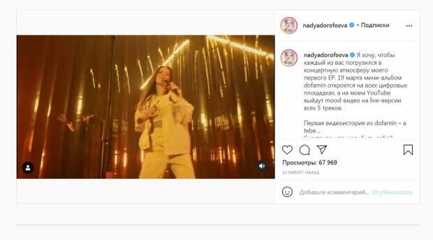 Благодаря длине одежды оголился упругий животик. Также красотка была в широких брюках. Красотка соблазнительно двигалась в разных локациях, она виляла бедрами, покоря своей грацией. В посте Надя рассказала, что скоро выйдет ее первый EP - мини-альбом dofamin, а также она опубликует mood-видео на live-версии всех 5 треков. "Первая видеоистория из dofamin – a tebe… Счастлива, что могу быть собой, быть свободной, превращать свои воспоминания в истории и кайфовать от музыки", - написала артистка. Всего за 50 минут кадры собрали почти 70 тысяч просмотров. "Меня одну смущает мат в песни?(((", "Ееее, пожар