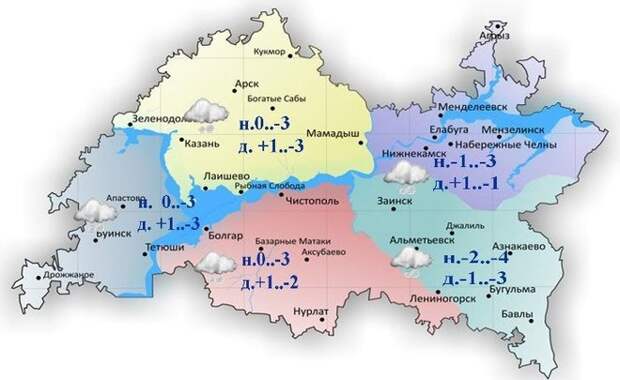В Казани ожидается от +1 до -3 градусов. В Набережных Челнах синоптики прогнозируют от -1 до +1 градусов. На дорогах гололедица, местами снежные заносы, снежная каша.