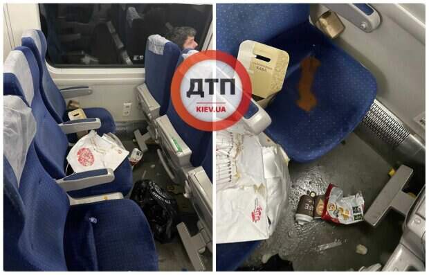 Пассажиры устроили настоящий "свинарник" Как передает Politeka.net, фото вопиющего инцидента в поезде "Интерсити" Киев - Львов показали "dtp.kiev.ua" в Facebook. На опубликованных кадрах видно, что пассажиры после себя кучу объедков, лужи, рваные упаковки, обертки, стаканчики и пакеты с мусором как на креслах, так и на полу.