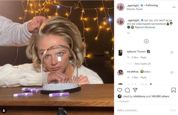 Настя Ивлеева села за барную стойку прямо напротив стеклянного украшения так, что видно искривленное лицо с нелепым выражением. Мужская рука из-за кадра поправила красотке волосы и заинтриговала пользователей сети. Впрочем, ведущая отметила на фото стилиста Алексея Ярославцева. "Тук-тук, кто там?! ах да, это же новогоднее настроение!