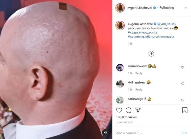 На одном из роликов юморист запечатлен в зале, густо усыпанном золотистым конфетти. Одна блестящая бумажка удачно приземлилась на лысину Евгения, и это заметил его коллега Юрий Великий. По словам самого Кошевого, автор записи "раскрыл тайну бритой головы" украинцам. "Вот так лысый и растерял все свои волосы", - произнес Юрий за кадром, чем рассмешил обладателя лысины. Пользователи поддержали веселый настрой в комментариях: "Копилка"; "Я думала, уже чип у Жени