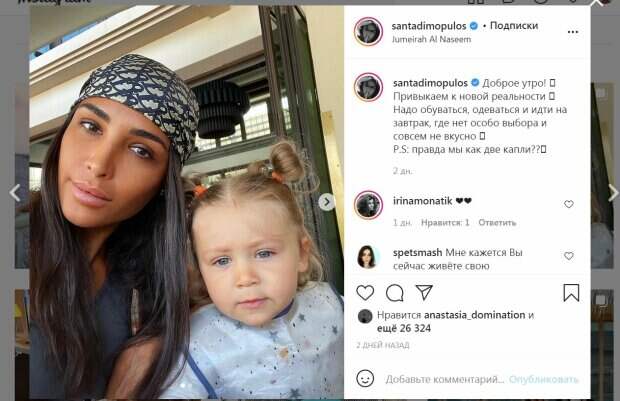 Певица и победительница шоу "Танці з зірками" Санта Димопулос проводит время с семьей на отдыхе Звезда вместе с детьми и мужем отдыхает в теплых краях, откуда делится снимками и рассказывает о "новой" реальности, сообщает Politeka.net. Красотка публикует как горячие, так и снимки с семьей. Известно, что сначала Санта вместе с родными прилетели в Дубай, позже они были на Мальдивах, а в одном из последних постов звезда поставила снова геолокацию отеля в ОАЭ.