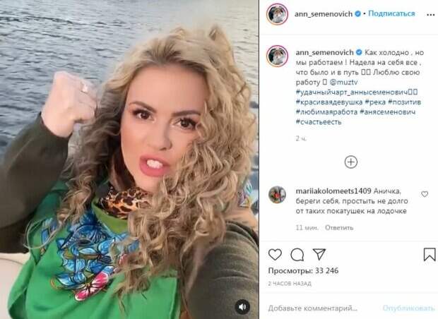 Известная певица Анна Семенович показала, как проводит рабочие будни Звезда пожаловалась на холод, ведь съемки проходили на катере, пишет Politeka.net. Артистка записала видео прямо с места событий. (Чтобы посмотреть, доскролльте до конца страницы) Анна надела цветной шарфик, куртку и укрыла ноги, однако это не спасает от холодного ветра.