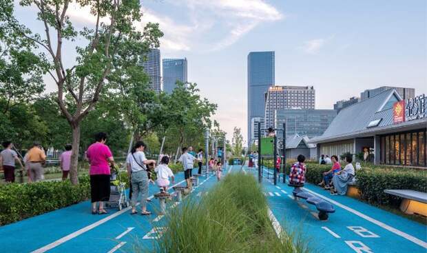 Команда городских дизайнеров и планировщиков из компании Sasaki превратила полуразрушенную взлетно-посадочную полосу в китайском Шанхае в популярный общественный парк. Как дань прошлому, в проекте сохранили элементы бывшего аэропорта. При этом в пространство интегрировали экотехнологические решения, вроде структур из переработанных материалов и системы сбора дождевой воды.