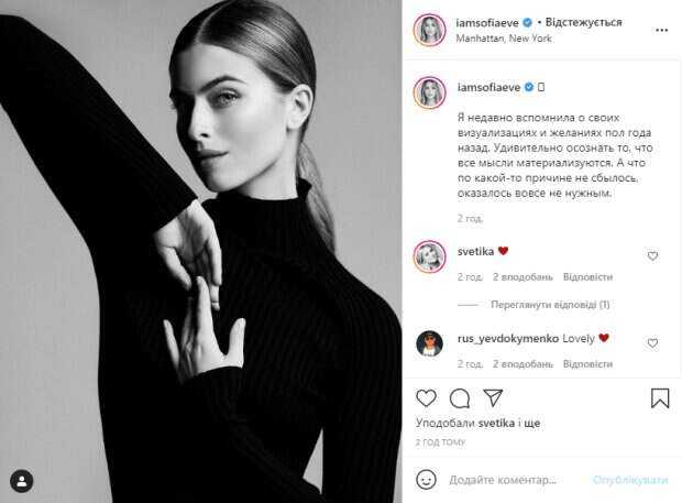 Так, в этот раз Соня выложила в сеть очаровательное черно-белое фото, на котором позирует в удивительном образе и необычной позе. Как видно, красотка появилась бед камерой в закрытом черном свитере, который подчеркнул ее стройное тело, но скрыл все прелести. Ее волосы аккуратно зачесаны и собраны в хвост, а на лице легкий макияж, она уверенно смотрит прямо в объектив, интересно сложив руки. Геолокация к снимку свидетельствует о том, что он был сделан в нью-йоркском Манхеттене. В подписи к публикации Евдокименко раскрыла секрет, как исполнять свои желания. "Я недавно вспомнила о своих визуализациях и желаниях полгода назад. Удивительно осознать то, что все мысли материализуются. А что по какой-то причине не сбылось, оказалось вовсе не нужным", - написала модель. А фолловеры кинулись обсуждать новый пост девушки, восхищаясь ее образом и словами. Примечательно, что новій пост девушки лайкнули все члены ее звездного семейства. "Идеальна", "Прекрасная", "Вы правы", "Красивая девушка", "Техники визуализации действительно крутые", "Красотка", - пишут пользователи в комментариях к фото Сони. Напомним, что внучка Ротару произвела фурор роскошной внешностью и раскрыла свой секрет: «Какая же красотка» Как сообщала Politeka, 19-летняя внучка Ротару в крохотном топе провела сеанс соблазнения: "Просыпайтесь. ..". Также Politeka писала, что 19-летняя внучка Софии Ротару показала, как наслаждается жизнью с женихом-миллионером: фото счастливой парочки.
