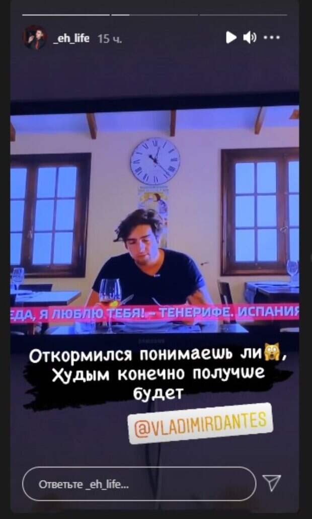 На то время он был одним из ведущих кулинарного трэвел-шоу "Еда, я люблю тебя". На кадрах запечатлен момент, когда Дантес вместе с коллегами пробовал местные деликатесы в Тенерифе, Испания. В глаза сразу же бросаются его круглые щечки и заметно оплывшие руки. Таким мужа Дорофеевой уже и не помнят, ведь с тех пор он значительно похудел. "Владимир, а сх*ра ли вы тут такой жирный?, - спрашивает на кадрах пользователь. - Откормился, понимаешь ли... Худым, конечно, получше будет". Дантес отреагировал на замечание в своей саркастической манере: "Я сам в шоке)))". До этого муж Дорофеевой, общаясь с подписчиками в "сториз", рассказал о еще одной своей перемене во внешности, при чем тоже в лучшую сторону. Речь о его прическе. Владимир уже много лет носит длинные волосы, несмотря на просьбы поклонников подстричься. Певец объяснил наглядно, почему ему комфортно с такой стрижкой и почему он не хочет ничего менять, прикрепив фото, на котором у него короткие волосы. Казалось, что это другой человек. Снимок был сделан еще в школьные годы. "Все детство и юность был коротко стриженным. Теперь не хочу", - написал Дантес. Напомним, известный украинский музыкант и муж Нади Дорофеевой Владимир Дантес рассказал о необычной просьбе своей жены А еще Politeka писала, что муж Дорофеевой решился на смелый эксперимент, оставив мужа Кухар ни с чем Также Politeka сообщала, что Дантес в непристойном девчачьем боди с вырезами заткнул за пояс Дорофееву