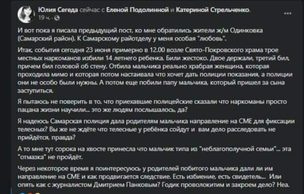 В Днепре наркоманы напали на ребенка Как передает Politeka.net, об инциденте рассказала адвокат Юлия Сегеда на своей страничке в Facebook. По ее словам, все произошло 23 июня примерно в 12.00 возле Свято-Покровского храма. "Трое местных наркоманов избили 14 летнего ребенка. Били жестоко. Двое держали, третий бил, причем бил головой об стену.
