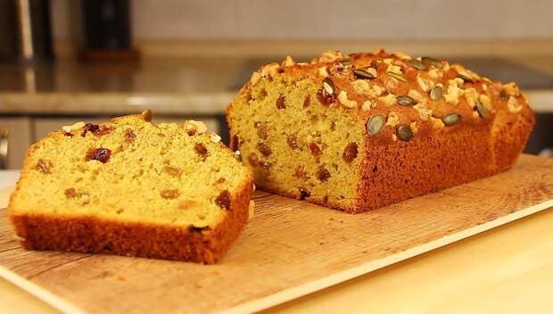 л. Имбирь сушеный – 1/4 ч. л. Мускатный орех – 1/4 ч. л. Ванилин – 0,5 г Цедра лимона – 1 ч. л. Мука пшеничная – 210 г Орехи грецкие – 30 г Тыквенные семечки – 10 г Приготовления: Очищенную тыкву нарезать кубиками, сложить в кастрюлю и залить водой (почти доверху). Накрыть крышкой и поставить на средний огонь. Варить до мягкости тыквы примерно 10 минут. Затем слить лишнюю жидкость и перебить блендером до состояния пюре. Просеянную муку смешать с разрыхлителем и ванилином. Яйца взбить с сахаром до светлой и пышной массы. Добавить тыквенное пюре, соль, цедру лимона и специи. Перемешать. Небольшими порциями влить подсолнечное масло. Затем постепенно добавить мучную смесь и замесить тесто. В последнюю очередь добавить еще изюм. Форму для кекса застелить бумагой для выпечки. Распределить тесто, сверху посыпать крупными кусочками грецких орехов и тыквенными семечками. Выпекать около 50 минут при 180 ℃. Степень готовности проверить деревянной зубочисткой, она должна быть сухой. Подробный рецепт приготовления кекса смотрите в коротком видео. Приятного аппетита!