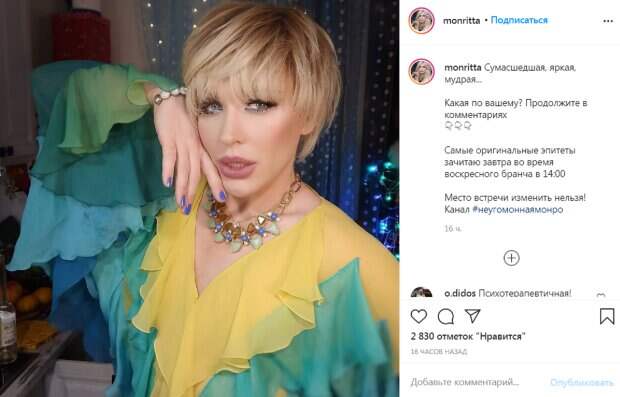 "Сумасшедшая, яркая, мудрая... Какая по-вашему? Продолжите в комментариях. Самые оригинальные эпитеты зачитаю завтра во время воскресного бранча в 14:00", - написала она. На новом фото на Монро можно заметить традиционно очень "кричащий" наряд ярких цветов, голубой маникюр и эффектный макияж. На шее у травести-дивы массивное украшение с камнями, а на руке - блестящий браслет. В комментариях пользователи с радостью бросились отвечать на вопрос о том, какой видят Монро. "Билык в лучшие годы. А так прекрасна. Этот парик...", "Балдежная", "Да классная по жизни, и все", "Карнавальная, шипучая, ароматная, простая и сложная", "Вдохновляющая", "Магнетичная, хмельная, фантазийная, искрометно-чумовая", "Сильная и умная", "Невероятная", - пишут в комментариях. Напомним, что травести-диву Монро с новой прической и в красном меху перепутали с Сумской: "гораздо старше, чем...". Как сообщала Politeka, травести-дива Монро показала себя в халатике и ошарашила признанием: "становится стыдно за себя...". Также Politeka писала, что неугомонная травести-дива Монро решилась показать себя без прикрас и фильтров:"Все по-настоящему".