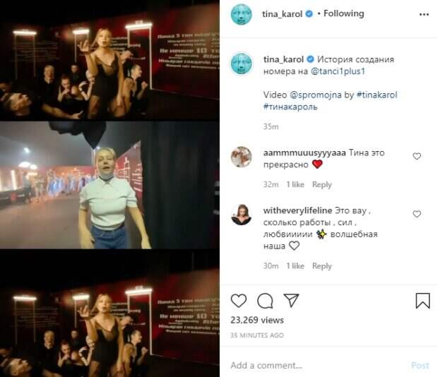 Во время своего выступления Тина Кароль в обворожительном черном платье прогулялась от гримерки до сцены, в подробностях показав закулисье шоу. В какой-то момент она даже встретилась с Григорием Чапкисом, элегантно поцеловавшим ее руку. Как оказалось, перед прямым эфиром она тренировалась и повторяла свой путь. В ролике совместили кадры репетиции и финального выступления, которое вошло в программу. Во время тренировки певица предстала в белом топе с короткими рукавами и воротничком, а также в защитной маске. По сравнению с выступлением кажется, что Тина вообще без макияжа. Образ довершила защитная маска, которую артистка спустила на подбородок. Показала она также как в просторном горчичном костюме отрабатывала энергичные танцы с молодыми партнерами, одного из которых уложила на пол. "История создания номера на @tanci1plus1", - подписала она видео. Пользователи соцсети восхитились талантом Тины и проделанной работе на шоу: "Тина это прекрасно ❤️"; "Это вау, сколько работы, сил, любвиииии ✨ волшебная наша