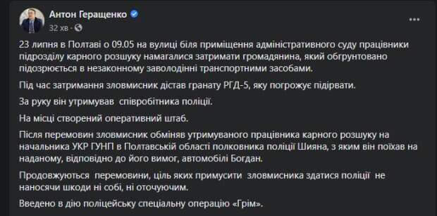 В Полтаве введена спецоперация "Гром" по обезвреживании преступника, который захватил заложника Как передает Politeka.net, об этом сообщил замминистра МВД Украины Антон Геращенко. "Во время задержания злоумышленник достал гранату РГД-5, которую угрожает взорвать. За руку он держал сотрудника полиции.