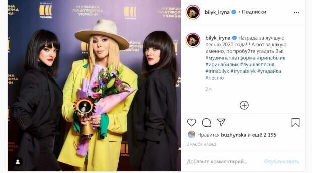 Макияж был сделан с акцентом на глаза. В руках звезда держала золотую награду и букет. Рядом с украинской знаменитостью позировали две стройные брюнетки. Две девушки-близняшки напоминали настоящих бестий. Все смотрели в камеру и слегка улыбались. "Награда за лучшую песню 2020 года!!! А вот за какую именно, попробуйте угадать Вы!", - написала Ирина. За два часа пост собрал более 2000 лайков и много комментариев. "Красная помада