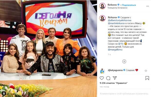 На новых фото довольный певец и малыши позируют в компании других участников шоу, в том числе и Галкина. «Сходили с Аллой-Викторией и Мартином в гости к Максу - «Не такое это простое дело — ходить в гости! В гостях главное — делать вид, что мы ничего не хотим». Кто помнит чья эта цитата? Так вот сегодня - я именно такой персонаж: неунывающий поэт. Скоро эксклюзив из жизни детей. Только для Максима», - подписал кадры Киркоров. Его поклонники тут же принялись комментировать пост. «Так мило смотреть на счастливую семью, где растворяются искренность с любовью!!!!», «Счастье Вам побольше в этой жизни!!», «Наша любимая троица», «Как же похожи детки на папу, особенно сынок!», «Какие же вы красивые», - пишут люди. Ранее мы писали, что Галкин поделился личным фото со своей супругой Аллой Пугачевой. На фото молодой Галкин стоит с цветущей Пугачевой возле стеллажа с игрушечными обезьянками. Парочка улыбается и смотрит в кадр. «18 лет назад», - коротко подписал снимок Галкин, тем самым уколов бывшего мужа примадонны Филиппа Киркорова, который на тот период состоял в законном браке с певицей. Напомним, Галкин больно уколол Киркорова, обнародовав кадр с еще его женой Пугачевой: «18 лет назад. ..». Как сообщала Politeka, Киркоров показал силу страсти прямо в ресторане, Бузова не удержалась. Также Politeka писала, что страстная Лобода сразила Киркорова экстремальным декольте до пояса, артист не сдержал эмоций.