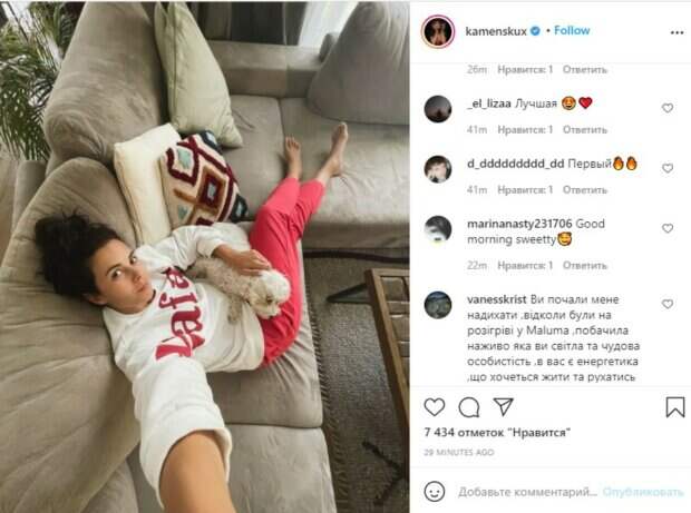 Свободное время причем певица проводит, как домоседка – сидит дома вместе со своей любимицей Мими и мужем Потапом. В этот раз Каменских показала, как обычно встречает утро и наслаждается свободным временем: «Sweetest sweet morning