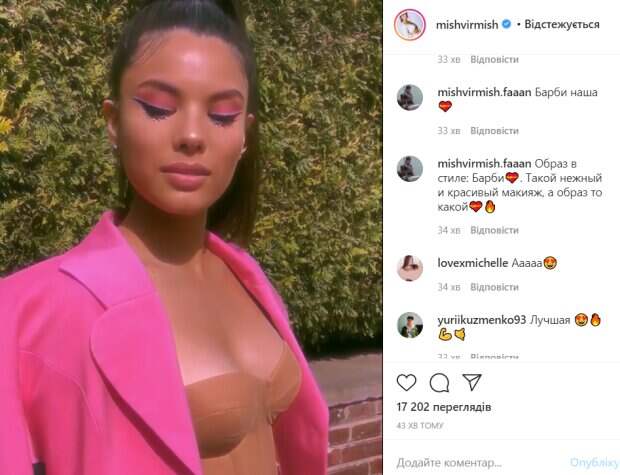 Сверху красотка накинула яркий розовый пиджак. Макияж Мишель заслуживает отдельного внимания. Девушке сделали яркие розовые глаза с черными стрелками и стразами. Она эффектно крутилась и позировала на камеру. За час видео Андраде посмотрели более 20 тысяч человек. В комментариях ей оставили массу приятных комплиментов. «Прикольная девочка! Грудь чуть чуть доделать и будет бомба, это по телу!!! А так сплошной позитив, очень нравишься, повезло Потапу! Удачи тебе, пусть у тебя всё в жизни получается!!! Я от души!!)», «Это самая красивая артистка Украины- точно!», «Разве можно быть настолько красивой???», «Барби наша», «Мы гордимся тобой», «Мишелька, ты очень офигенная, сладенькая и красивая!», - пишут пользователи сети. Ранее мы писали, что Мишель Андраде сверкнула фигурой в крошечном купальнике нежного розового цвета. Девушка засветила свою фигуру во всей красе. Напомним, что Мишель Андраде рванула с дочерью Потапа в Одессу и соблазнила пикантным разрезом: «Теперь я буду…». Как сообщала Politeka, подопечная Потапа с игривым декольте сжала руки, показав упругие формы: «Ох, как здорово!». Также Politeka писала, что Мишель Андраде сверкнула упругостями в пикантных позах: идеальный ракурс.