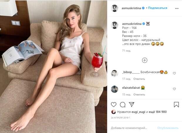 Кристина снимается вместе с Иваном Охлобыстиным, как когда-то ранее (звезды уже были коллегами на съемочной площадке сериала "Интерны"). В то же время поклонники едко высмеивают ее развод, а сама звезда избегает любых распросов по поводу ее карьеры и личной жизни. Личное фото Кристины, сделанное ранее, также подверглось бурном обсуждению. На новом кадре Асмус позировала в белой пижаме с кружевами и придерживая массивный бокал с коктейлем в руках. «Рост – 164. Вес – 45. Размер ноги – 36. Цвет волос – натуральный ...это все про диван