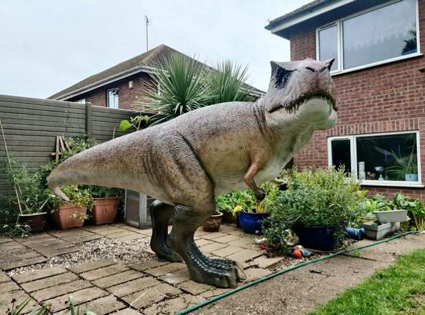 Адриан Шоу из Лимингтон-Спа, Уоркс, испугал свою жену Дебору на свою жизнь, когда она обнаружила могущественного зверя в их саду посреди ночи.Муж, которого жена попросила привести в порядок их сад, вместо этого решил удивить ее тираннозавром.52-летний Адриан Шоу купил динозавра из стекловолокна за 1600 фунтов стерлингов вместо садового гнома, который его 53-летняя жена Дебора попросила его купить.