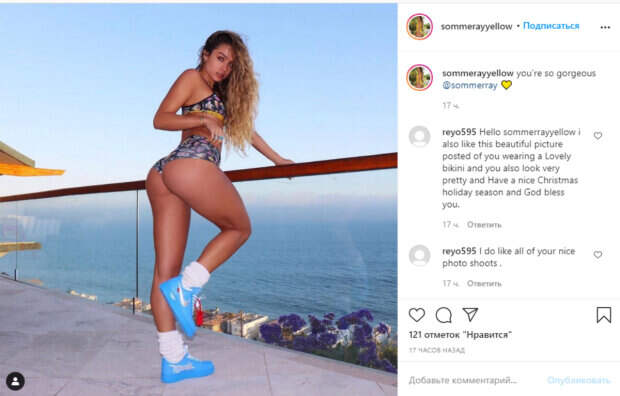 В этот раз Соммер показала себя в темном спортивном белье с мелким принтом и покрутила достоинствами на террасе. Яркая блондинка, благодаря удачному ракурсу и довольно тесной ткани также показала свою пятую точку, которой так гордится. Как известно, девушка всегда делает акцент именно на ягодицах, и ее фирменная поза «со спины» уже стала для нее привычной. «Кажется превзошла всех