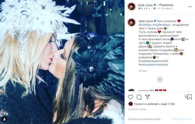 Среди них — Ирина Билык, которая приготовила подружке особый подарок. На своей странице в Инстаграм Былик обнародовала архивное фото, на котором две певицы целуют друг друга в губы. «Моя любимая ❤️ @nataliya_mogilevskaya , поздравляю тебя с твоим днём✨! Пусть любовь💖 приносит тебе вдохновение и удовольствие! А твои красивые песни🎶летят✈️по свету🌍и радуют людей! Друзья🙋🏼♀️! Давайте вместе в комментариях поздравим🥳мою подружку Наташеньку с Днём🎂рождения🎊!!!», - написала Ирина Билык. Пользователи сети также присоединились к поздравлениям. Архивный снимок понравился многим и среди тех, кто лайкнул фотографию оказалась еще одна украинская певица Ани Лорак. «Ничего себе страсть», «С Днем рождения!!!Пусть все задуманное сбывается!!!🌷», «С, Днём рождения, Наташенька! классная , умная, позитивная, душевная! Будь счастлива❤️❤️❤️», «Какая нежность», - пишут в сети. До этого мы сообщали, что Ирина Билык покрасовалась на природе в ярком женственном платье. Билык вовсю продемонстрировала свое шикарное платье с пышной юбкой, стоя на природе. Розовый наряд артистки со множеством складок и рюшей явно впечатлил певицу. Она бодро покрутила юбку платья в разные стороны. Ее образ дополнил крупный цветок в волосах того же оттенка. Напомним, Билык заступилась за "родных" россиян перед Украиной: "В чем они виноваты?". Как сообщала Politeka, Билык с перекроенным лицом взбудоражила видом после шумного праздника: фото облетело сеть. Также Politeka писала, что Могилевская посветила лифчиком прямо на сцене, пикантные кадры: «Я обещала вам…».