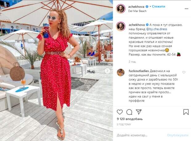 "Пышный", с рюшами, верх, приталенная середина с изящным кожаным пояском и свободна юбка до середины икры с соблазнительным разрезом - наряд красотки сорвал овации в комментариях. Анфиса с коктейлем в руках скрыла лицо за крупными солнцезащитными очками, и по всему, видно, что наслаждается моментом. "А пока я тут отдыхаю, наш бренд @by.che.dress потихоньку оправлятся от пандемии, и отшивает новые красивые платья и костюмы! На мне как раз наша сочная горошковая новиночка😉 Размер, как вы помните, 42-54 🍒", - поделилась в подписи звезда. Некоторые пользователи отметили, что Анфиса набрала лишние кг за время карантина: "Платье просто огонь❤️❤️❤️" "Худеть, так и не стали? не мешало бы...видно же..." - "А что не так? У Анфисы очень красивая, женственная фигура, стройные ножки. Зачем ей худеть до костей... чтобы греметь ими? Завидуйте Молча". "Это платье создано прям для этого фона 😁" "Анфиса, вы как всегда очаровательны🌺" "Анфиса😁 у тебя фигура шикарная😘. Как контрабас ☝️" Ранее мы сообщали, Анфиса в черном полупрозрачном платье взбудоражила фото с пляжа. Изюминкой кадра стал мужчина на заднем фоне, который с интересом наблюдал за ведущей. "Мужчина позади Вас))) не сводит глаз 😂"; "Вы в купальнике выглядите лучше, чем в этом платье😋"; "Ты так и не смогла перестать жрать🙈"; "Эх, завидую 😊👍"; "Вы шикарны! ", - отреагировали пользователи. Напомним, Анфиса Чехова смело избавилась от белья и улеглась на пол ради пикантных кадров Также Politeka писала, что Чехова бессовестно сверкнула аппетитным силуэтом в тонкой пижаме А еще Politeka сообщала, что Анфиса Чехова неожиданно показала своего главного мужчину, личные кадры