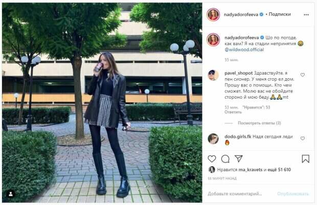 net со ссылкой на страничку знаменитости. "Что по погоде, как вам? Я на стадии непринятия", - написала Надя. Фанаты поставили более 50 тысяч лайков и написали комментарии: "Надя сегодня леди", "Я на стадии ОТРИЦАНИЯ такой дождливой и ветреной погоды", "Тебе идет черный", "Ты латте в другом месте теперь покупаешь?", "Как всегда на стиле", "Стройняшка", "Так, кто смог разглядеть, что нарисовано на стаканчике?", "Ужасно стильная, ты вдохновляешь меня Надь. Стараюсь тоже так одеваться", "В руках ключи машины", "Тебе очень идёт эта высокая красивая обувь", "О, даже одежда есть, оказывается)))", "Я тоже на стадии непринятия". Сообщалось, что популярная украинская певица Надя Дорофеева сверкнула идеальными ножками в соблазнительном «утепленном» образе. На фото звезда позирует у белой стены в коротком черном платье с длинными рукавами, напоминающем балахон. Юбка наряда едва прикрывает ножки красотки, выставляя на всеобщее обозрение ее колготы в сеточку с украшением из страз, напоминающим край чулок. Напомним, игривая Надя Дорофеева в сетке потрясла «орешком», засветив лишнее Также Politeka писала, что Могилевская зажгла с Дорофеевой и звездами "Квартал 95" и поразила обращением А еще Politeka писала, что Дорофеева показала, что такое стиль, в наряде со смелыми вырезами