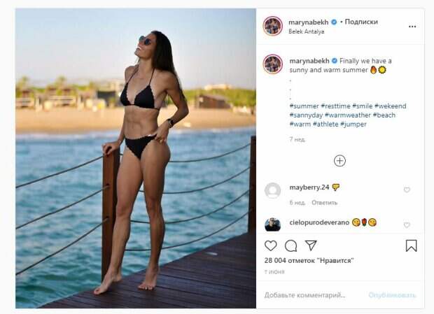 Марина Бех-Романчук, Элина Свитолина, Ирина Морозюк и другие звезды спорта показали, как отдыхают на море На первом фото легкоатлетка Бех-Романчук. Красотка стояла в черном купальнике на деревянном мостике. Марина улыбалась, а образ дополнила стильными очками. Девушка без смущения показывала свою фигуру, которая у нее выглядит идеально.