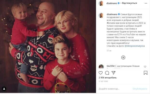 Только глава семейства надел темносиний свитер. «Семья Крутоголовых поздравляет с наступающим 2021 всех хороших и добрых людей. Желаем вам всем встречать в 2021-м только хороших и добрых людей! Будьте здоровы, счастливы и насмешены! Будем встречать вместе с вами на ICTV и в YouTube на нашем канале! Мы сняли 5 часов новогодних номеров и музыки, так что присоединяйтесь!», - написал юморист. Поклонники «Дизель шоу» благодарят артиста и также поздравляют его с Новым годом. Как известно, Егор Крутоголов уже 13 лет счастлив в браке с Екатериной Крутоголовой. Пара воспитывает двух сыновей — десятилетнего Льва и годовалого Макса. Отметим, в честь рождения второго ребенка Егор Крутоголов подарил жене роскошный автомобиль. Напомним, звезда "Дизель Шоу" Егор Крутоголов поразил внешностью в париках и без: "Заряжайтесь мощным позитивом". Как сообщала Politeka, звезда "Дизель Шоу" Егор Крутоголов устроил взбучку "обидчику" украинцев: "Пошел вон отсюда!" Также Politeka писала, что звезда "Дизель шоу" Егор Крутоголов заинтриговал видом своих подросших сыновей: "Малой - копия Дзидзьо"