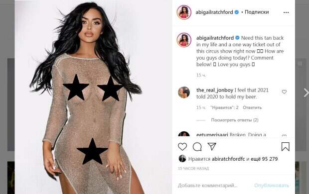 Красотка впечатлила большими формами без белья, откровенно сверкая ими. Бюст красиво смотрелся под прозрачной тканью и завораживал красотой. Кроме того, что невооруженным взглядом видно, что красотка без белья, но также она без трусиков. Тонкая талия, плоский живот и пышные бедра - еще одни достоинства шикарной фигуры звезды. "Хочу такой же загар и билет в один конец на это цирковое представление прямо сейчас